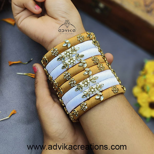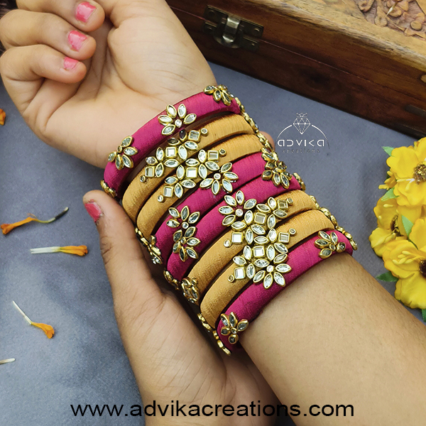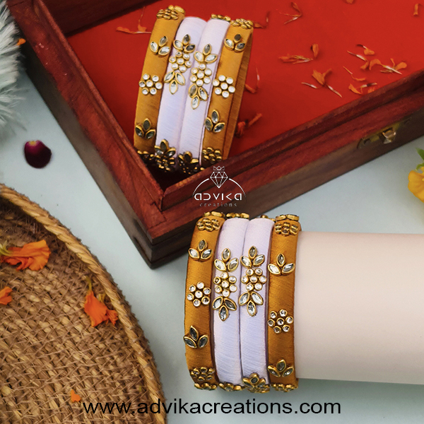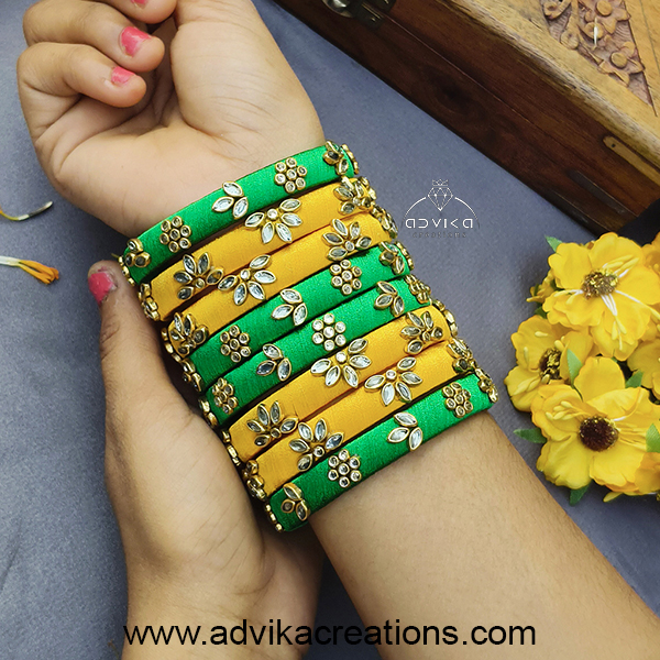 Add a pop of elegance to your festive or wedding look with this exquisite bangle set. These bangles are meticulously wrapped in soft yellow and green silk threads, creating a stunning dual-tone contrast that instantly catches the eye. Each bangle is adorned with sparkling Kundan stones, delicately placed to enhance the richness and traditional charm of the design.
