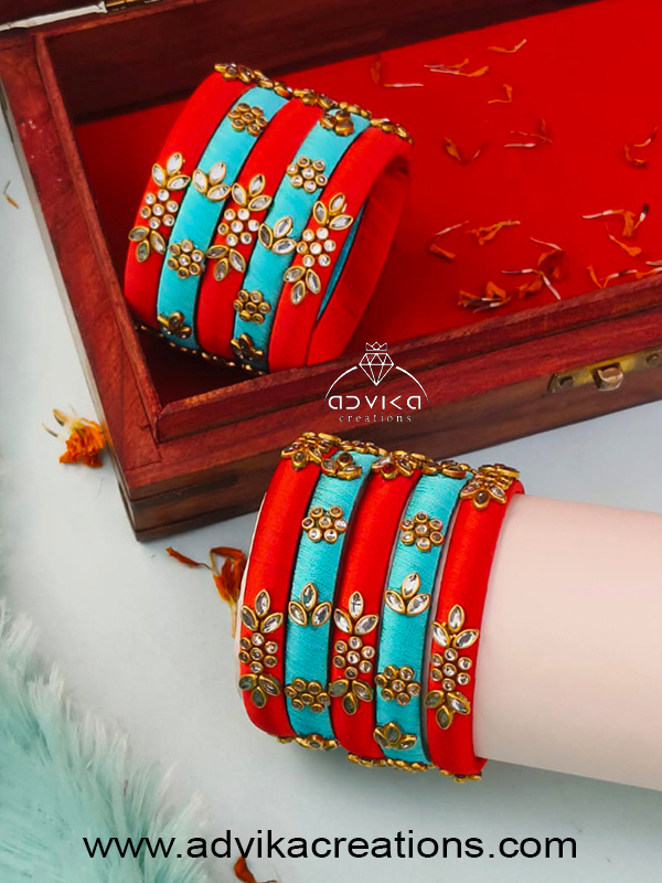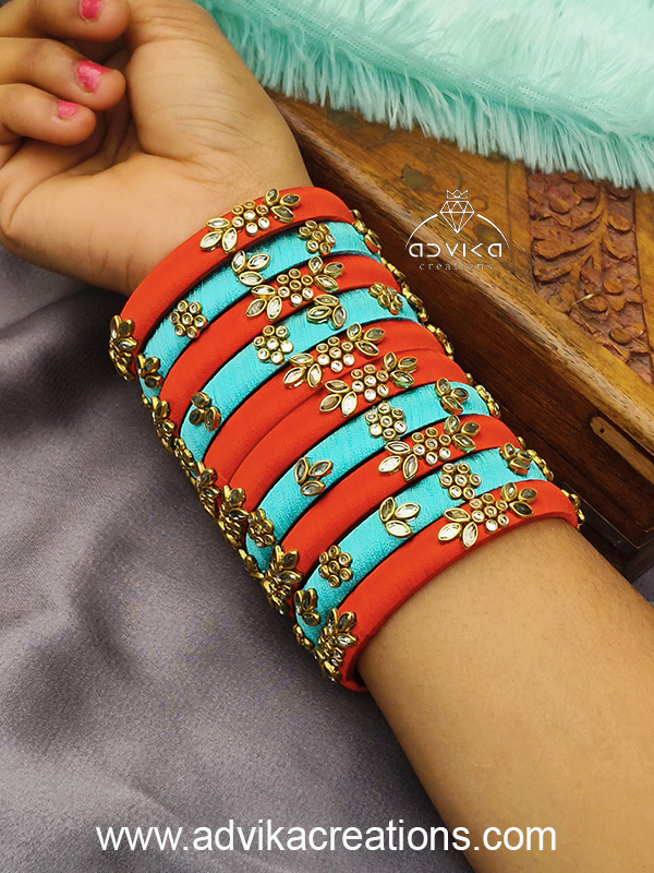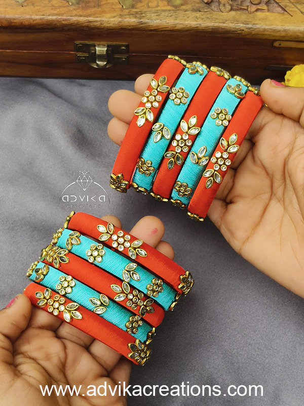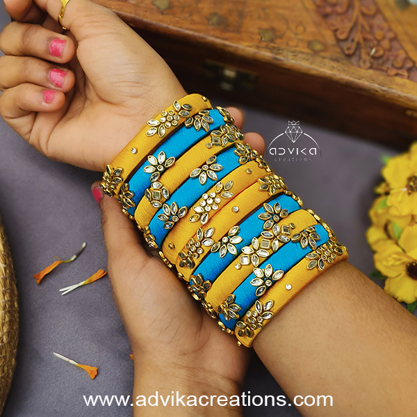 Add a pop of elegance to your festive or wedding look with this exquisite bangle set. These bangles are meticulously wrapped in soft sky blue and vibrant yellow silk threads, creating a stunning dual-tone contrast that instantly catches the eye. Each bangle is adorned with sparkling Kundan stones, delicately placed to enhance the richness and traditional charm of the design.