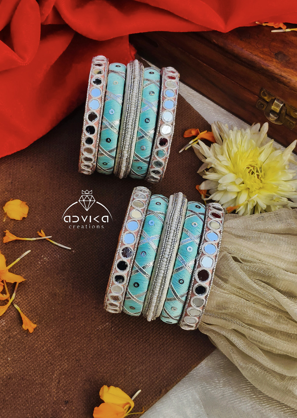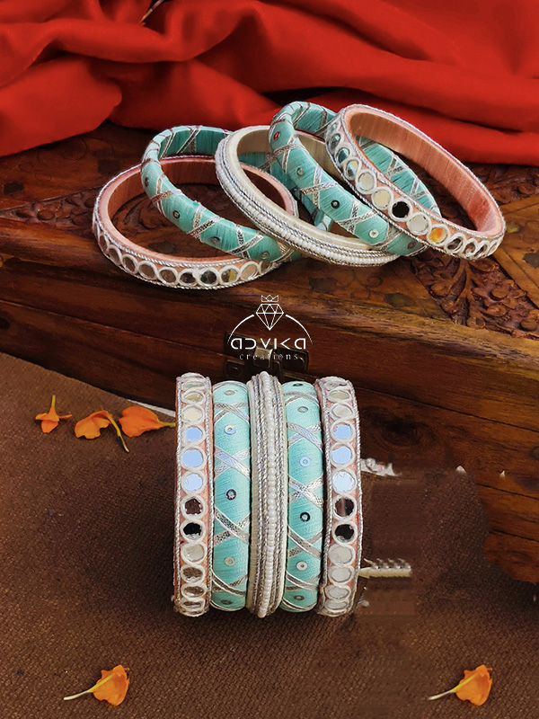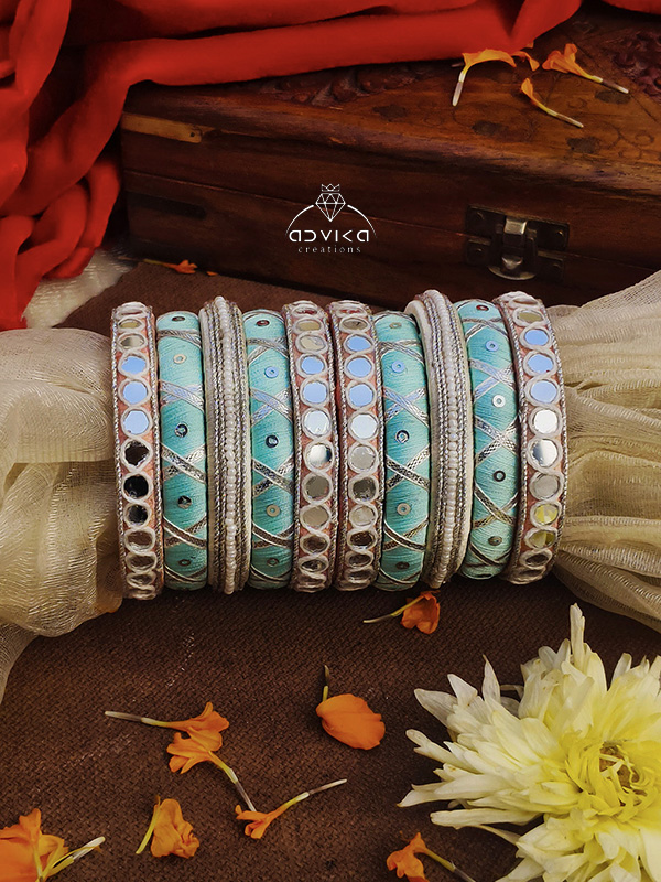 Expertly wrapped in high-quality silk thread, the bangles feature an alternating color palette of serenity blue and pristine white. The design is intricately detailed with sparkling Silver Gota lace work and authentic Mirror embellishments that catch the light beautifully. To complete the look, delicate Silver Zari winding and fine Seed Beads add texture and a rich, artisanal finish.