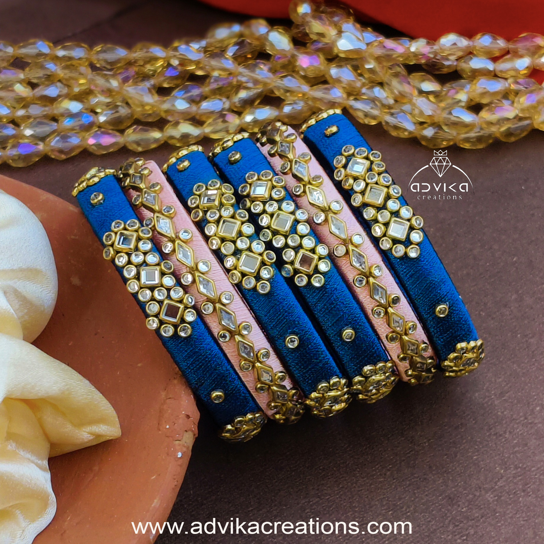 Give your traditional look a royal touch with this exquisitely handcrafted Silk Thread Bangle Set in a graceful combination of peach and blue. Designed with precision and elegance, each bangle is wrapped in premium silk thread and embellished with high-quality Kundan stones, creating a perfect balance of shine, style, and sophistication.