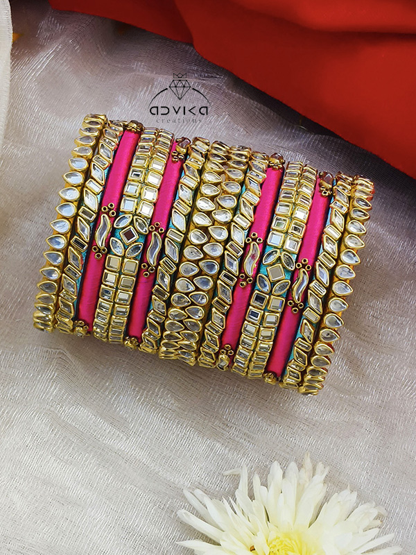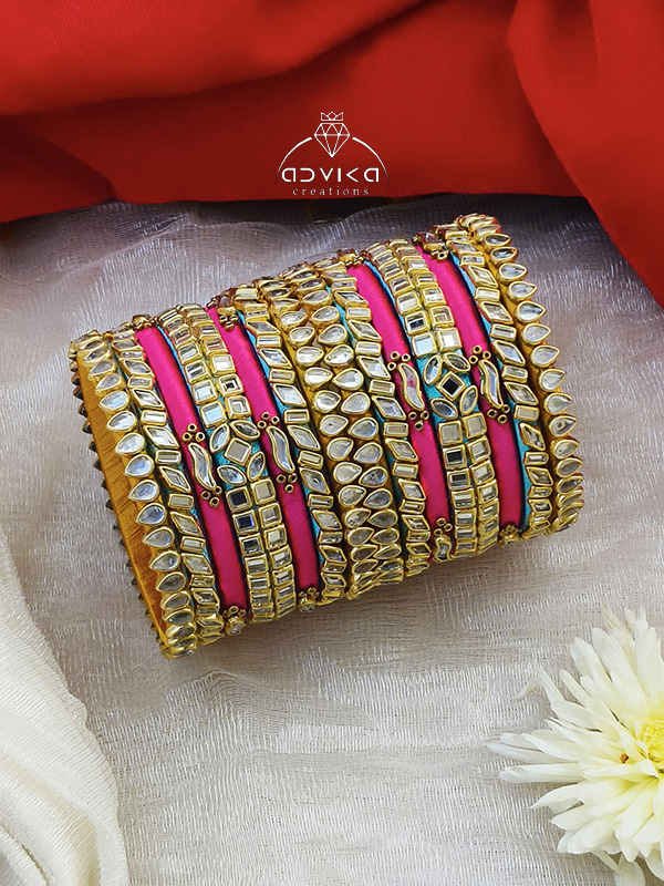 Add a vibrant festive charm to your jewellery collection with these beautifully handcrafted multicolor silk thread bangles. Each bangle is neatly wrapped with premium silk thread in a lively mix of colors, creating a rich and traditional look. The design is further enhanced with delicate seed bead detailing and sparkling kundan stones, giving the bangles an elegant yet eye-catching appeal.