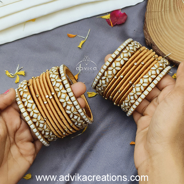 Add timeless elegance to your traditional look with these beautifully handcrafted white and golden silk thread bangles. Meticulously wrapped in premium silk thread, the bangles are adorned with exquisite ceramic kundan stones that reflect a soft, royal glow. The golden base paired with white highlights creates a graceful balance of sophistication and tradition.