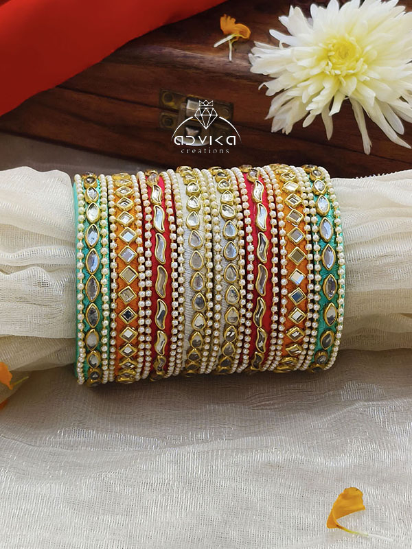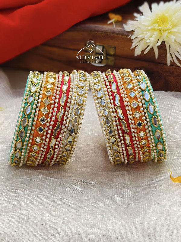 Add a vibrant charm to your festive look with these beautifully handcrafted multicolor silk thread bangles. Wrapped meticulously in rich silk threads, this design is enhanced with shimmering kundan stones and a delicate pearl chain, creating a graceful balance of tradition and elegance.