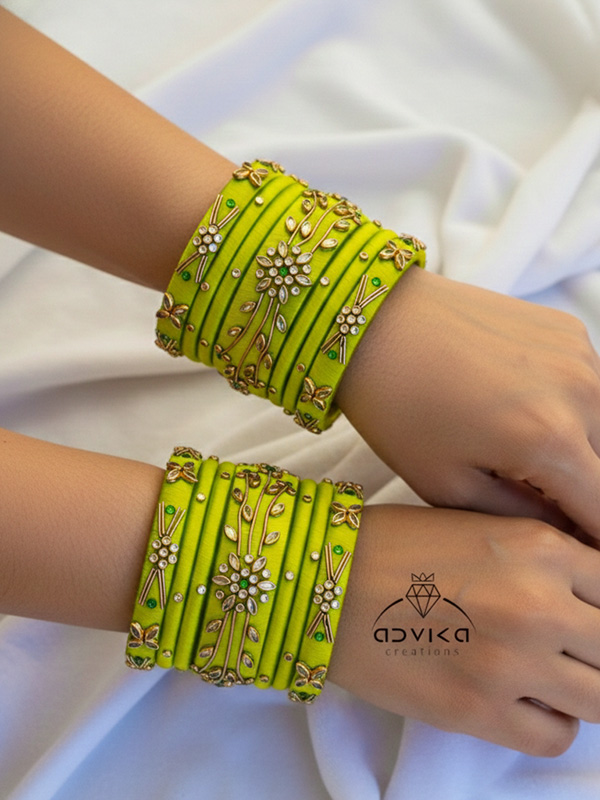 Presenting a stunning Silk Thread Zardozi Flower Bangle Set in a Parrot Green shade, handcrafted to perfection for weddings, festivities, and traditional ceremonies. Each bangle is wrapped in premium silk thread and adorned with intricate zardozi work, giving it a luxurious handcrafted charm.