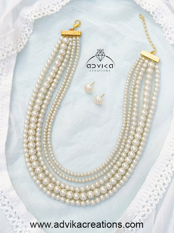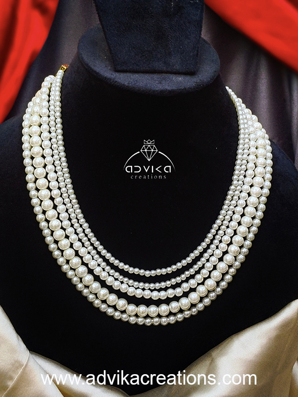 Elevate your traditional and fusion look with this elegant 5-layer pearl beads long necklace set, designed to add timeless grace and sophistication. The necklace features multiple strands of finely polished pearl beads arranged in five beautiful layers, creating a rich, cascading effect that enhances any outfit effortlessly.
