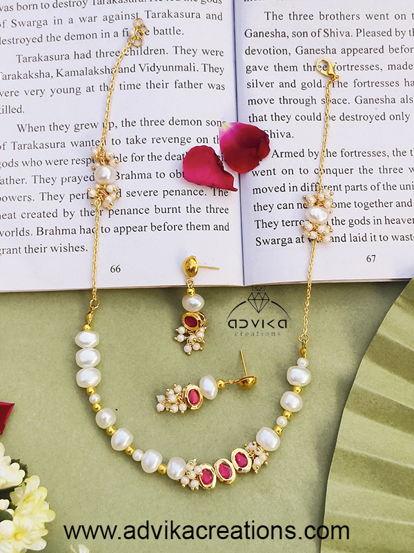 Add timeless grace to your ethnic look with this beautifully handcrafted pearl beads long necklace set, paired with matching earrings. The necklace features lustrous pearl beads arranged in a long, elegant silhouette, highlighted with pink kundan connectors that add a soft pop of colour and royal charm. Accented with golden beads and delicate loreals, the design reflects a perfect blend of traditional artistry and modern elegance.