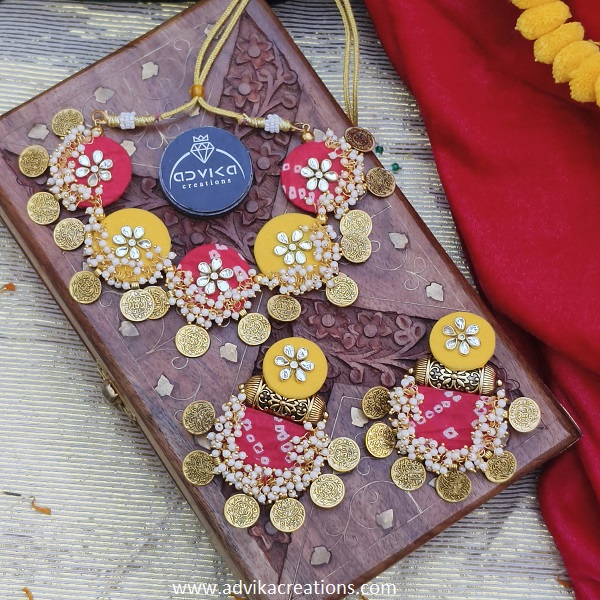 Celebrate the beauty of traditional craftsmanship with our Jaipuri Pink & Yellow Fabric Jewelry Set, featuring intricate beaded work that adds a touch of elegance to any outfit. This stunning set includes earrings designed with vibrant pink and yellow fabric that showcases the rich cultural heritage of Jaipur.