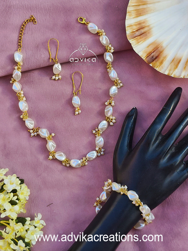Elevate your ethnic and festive look with this elegant handcrafted Mother of Pearl beads long necklace set, beautifully paired with matching earrings and a bracelet. Designed to reflect timeless grace, the soft iridescent shine of mother of pearl beads is perfectly complemented with delicate loreals, adding a traditional touch with graceful movement.