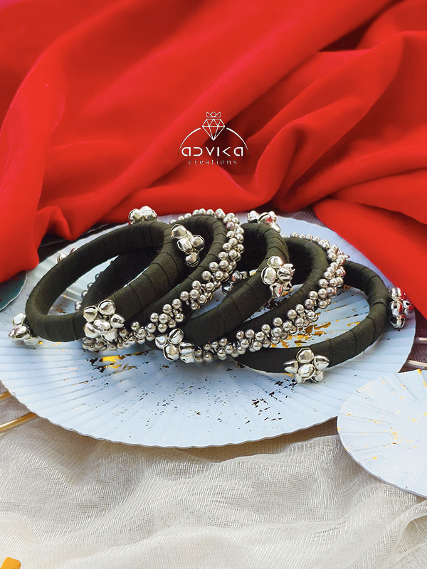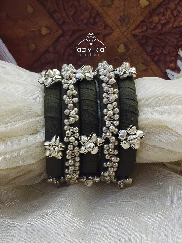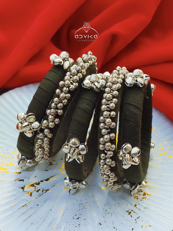 Add a touch of classic elegance to your ethnic look with this dark green fabric bangle set beautifully designed with silver ghunghroo. Wrapped in premium-quality fabric, the deep green tone gives a royal and graceful appearance, while the delicate silver ghunghroo add a subtle charm and gentle movement that enhances the overall design.