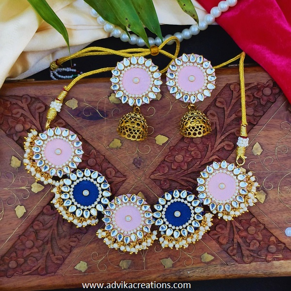 Embrace the beauty of tradition with our Blue & Baby Pink Fabric Jewelry Set, adorned with intricate Kundan work. This lightweight and elegant set includes a necklace & earrings.
