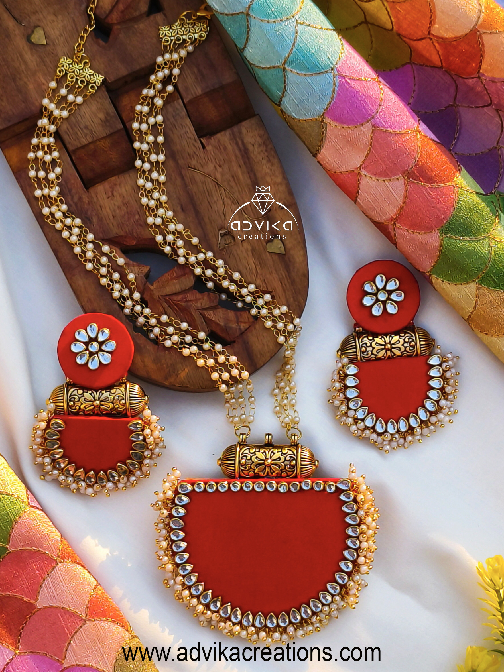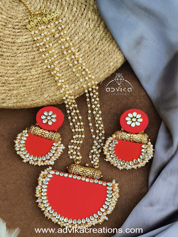 Elevate your festive and wedding look with this handcrafted fabric necklace set, beautifully designed to blend traditional artistry with modern elegance. This exclusive set includes a statement necklace paired with matching earrings, making it perfect for haldi, mehendi, weddings, parties, and gifting.