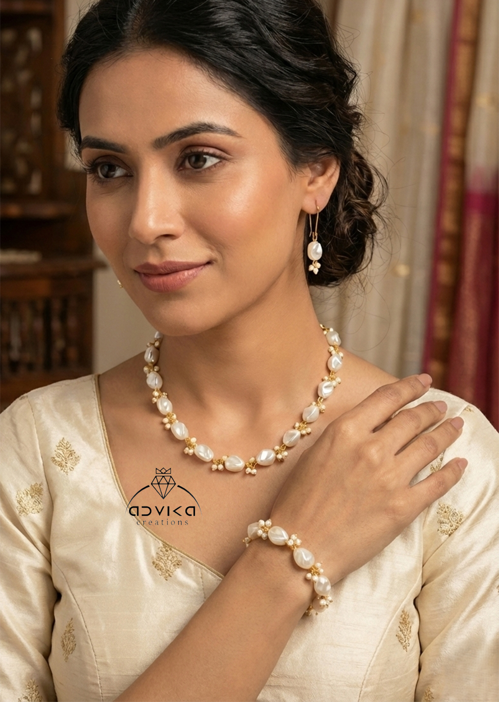 Elevate your ethnic and festive look with this elegant handcrafted Mother of Pearl beads necklace set, beautifully paired with matching earrings and a bracelet. Designed to reflect timeless grace, the soft iridescent shine of mother of pearl beads is perfectly complemented with delicate loreals, adding a traditional touch with graceful movement.